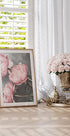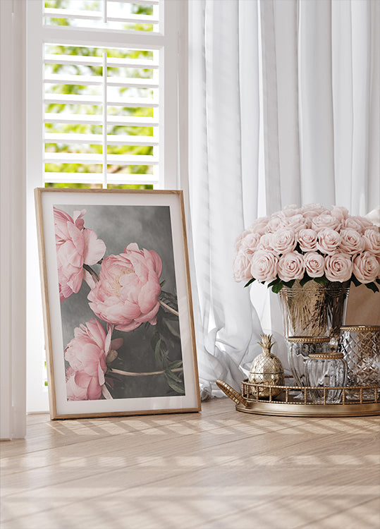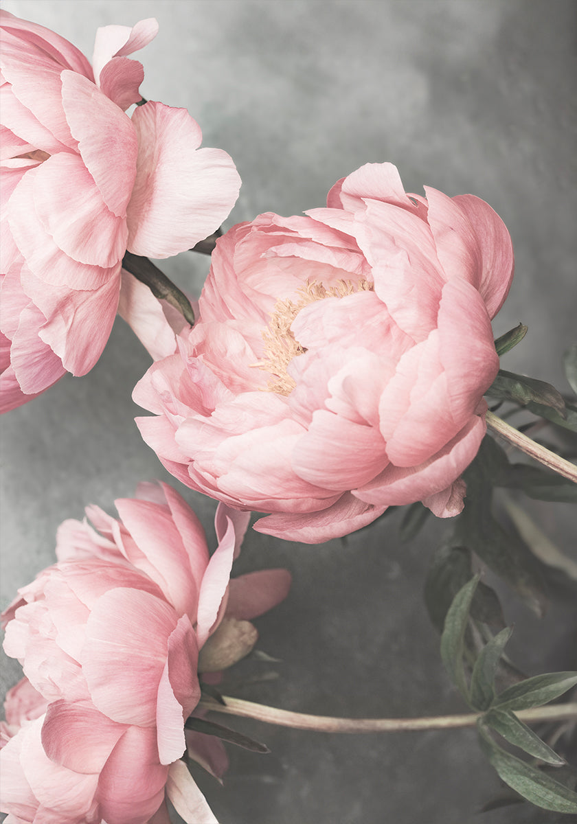 Ta elegancka fotografia kwiatowa przedstawia delikatnie różowe piwonie w pełnym rozkwicie, z delikatnymi płatkami rozwijającymi się z wdzięcznymi szczegółami. Stonowane tło podkreśla romantyczne pastelowe kolory i tworzy ponadczasową grafikę botaniczną, która emanuje pięknem, świeżością i naturalnym wyrafinowaniem.