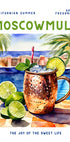Ten żywy plakat przedstawia orzeźwiającego muła moskiewskiego podawanego w miedzianym kubku w towarzystwie świeżych limonek i basenu w tle. Dzięki mocnym kolorom i letniej atmosferze oddaje radość cytrusów, świeżości i relaksu – idealne dzieło sztuki do kuchni, barów lub ścian obrazowych inspirowanych latem.