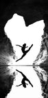 Ta uderzająca czarno-biała grafika przedstawia baletnicę z wdziękiem skaczącą do jaskini w kształcie serca, a jej odbicie odbija się w nieruchomej wodzie. Dramatyczna sylwetka łączy taniec, naturę i romans, tworząc potężny wizualny wyraz pasji, elegancji i ponadczasowego piękna artystycznego.