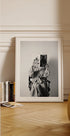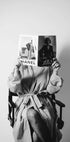 Wyrafinowane czarno-białe zdjęcie kobiety w trenczu i rajstopach w kropki, trzymającej magazyny o modzie z Chanel i Elle. Dzieło emanuje ponadczasowym stylem i paryską elegancją, doskonale sprawdza się jako wyrazisty element w nowoczesnych, świadomych mody wnętrzach.