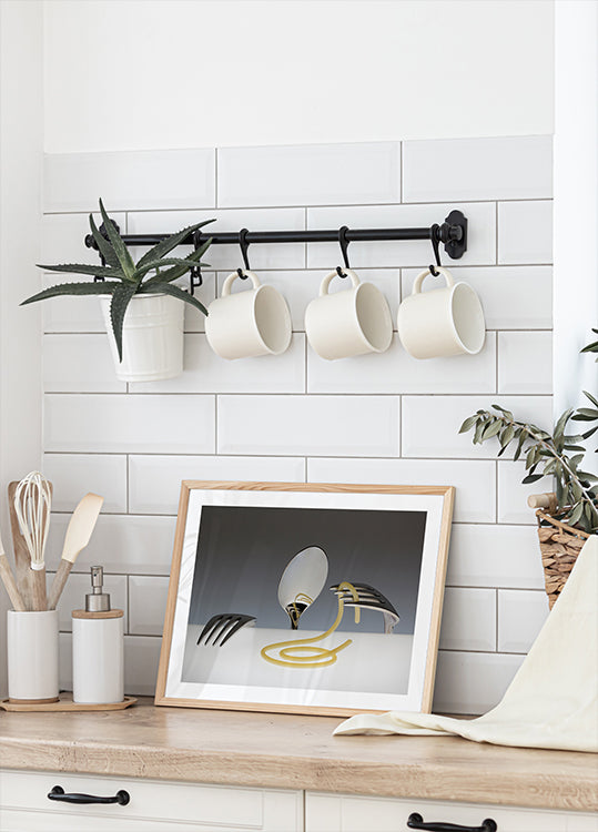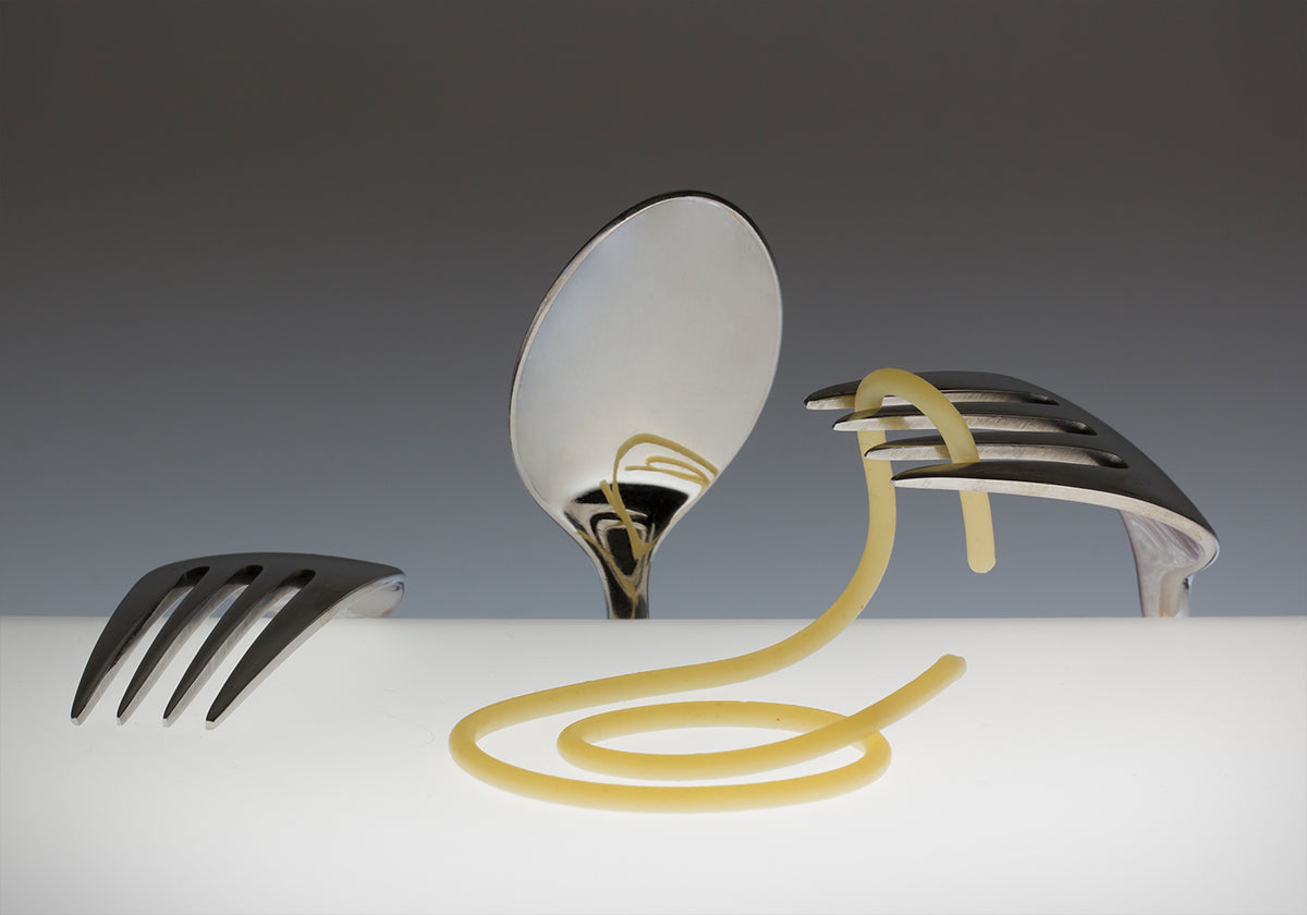 Zabawna martwa natura, w której widelce, łyżka i nić spaghetti tworzą humorystyczną kompozycję. Sztućce ułożone są w figury, a makaron pełni rolę rozwianych włosów. To dowcipne dzieło sztuki łączy jedzenie i fantazję, przekształcając codzienny posiłek w surrealistyczny, artystyczny portret.