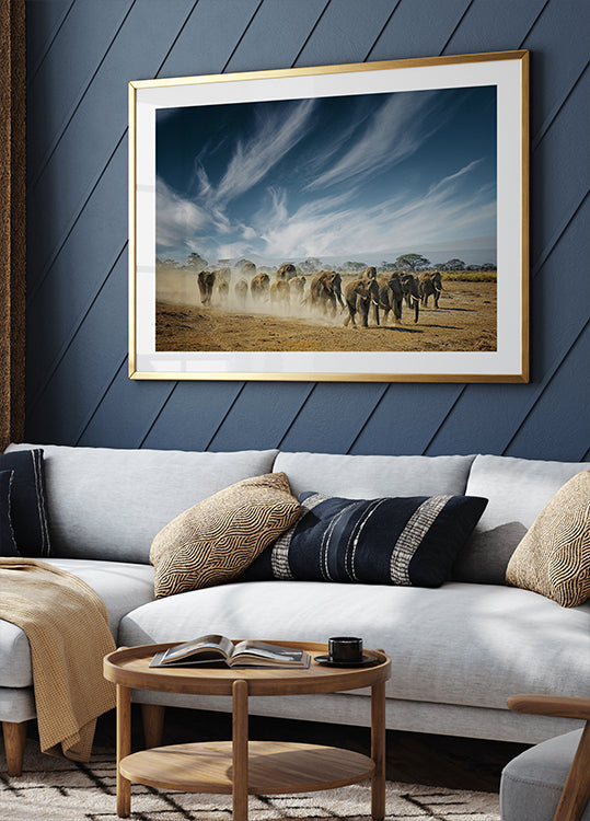 To efektowne zdjęcie dzikiej przyrody przedstawia majestatyczne stado słoni szarżujących przez zakurzoną sawannę pod rozległym niebem. Emanująca surową siłą, jednością i dzikim duchem Afryki, scena ta staje się wspaniałym dziełem sztuki, które celebruje naturę, wolność i wspaniałość dzikiej przyrody.