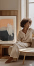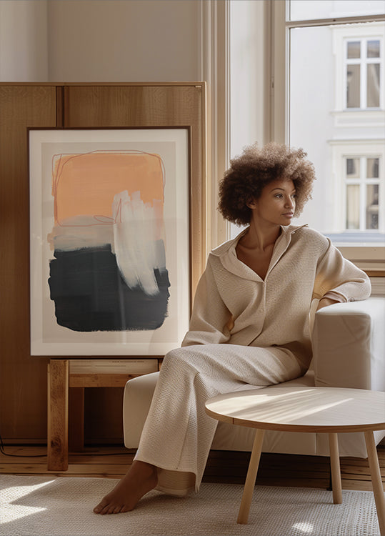 Nowoczesny abstrakcyjny plakat z odważnymi pociągnięciami pędzla w kolorze ciepłej brzoskwini, warstwowej szarości, głębokiej czerni i odrobiną delikatnej bieli. Teksturowane pociągnięcia i kontrastujące odcienie tworzą uderzającą kompozycję, która równoważy ciepło i głębię – idealna do wnętrz minimalistycznych, wystroju skandynawskiego lub stylowych ścian galerii.