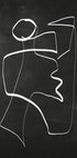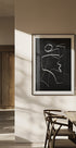 Uderzający abstrakcyjny plakat graficzny z wyrazistymi białymi kreskami na głębokim czarnym tle. Minimalistyczny, ale przyciągający wzrok, ten współczesny mebel podkreśla piękno prostoty i formy, idealny do wnętrz współczesnych, boho lub skandynawskich.