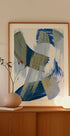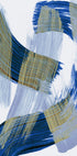 Uderzający abstrakcyjny plakat z mocnymi pociągnięciami pędzla w kolorze głębokiego błękitu, stonowanego złota i miękkiej bieli na czystym białym tle. Płynne pociągnięcia i warstwowe tekstury tworzą wrażenie ruchu i równowagi – idealne dzieło sztuki do nowoczesnych wnętrz, minimalistycznych dekoracji lub skandynawskich ścian galerii.