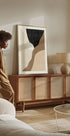 Spokojny, minimalistyczny plakat o płynnych organicznych kształtach w odcieniach miękkiego beżu, ciepłego brązu i głębokiej czerni. Dzięki neutralnej palecie i prostocie inspirowanej Japandi, grafika łączy w sobie nowoczesną elegancję i naturalny spokój - idealne do współczesnych wnętrz, skandynawskiego wystroju lub spokojnych ścian galerii.