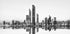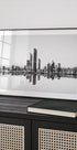 Przyciągający wzrok czarno-biały plakat przedstawiający Abu Zabi, przedstawiający nowoczesną panoramę doskonale odzwierciedloną w spokojnej wodzie. Eleganckie wieże, światła miasta i lustrzana kompozycja podkreślają architektoniczną elegancję i tętniący życiem duch stolicy Zjednoczonych Emiratów Arabskich.