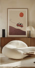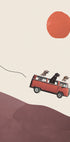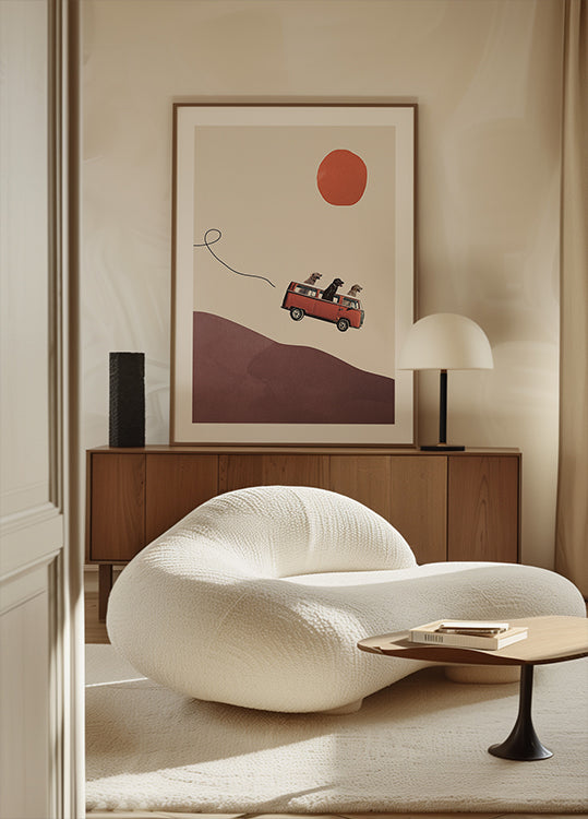 Zabawny i pełen humoru plakat przedstawiający psy prowadzące czerwony autobus VW po pagórkowatych wzgórzach w mocnym słońcu. Dzięki dziwacznemu stylowi kolażu, klimatowi retro i zabawnym wyrażeniom, grafika oddaje ducha wolności, przygody i przyjaźni.