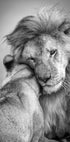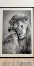 Wzruszający czarno-biały plakat przedstawiający dziką przyrodę, przedstawiający lwa i lwicę w czułym uścisku. To dzieło sztuki, uchwycone w Serengeti w Tanzanii, symbolizuje miłość, siłę i oddanie naturze. Idealnie pasuje do wnętrz natury, zwierząt i romantycznych.