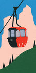 Odważna i zabawna ilustracja graficzna przedstawiająca czerwoną kolejkę linową przesuwającą się przez Alpy. Dzięki czystym liniom, płaskim kolorom i estetyce podróży w stylu retro, praca oddaje radość górskiej przygody i ponadczasowy urok transportu wysokogórskiego w nowoczesnym, artystycznym stylu.