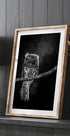 Uderzająca czarno-biała fotografia sowy siedzącej na gałęzi, z przenikliwymi oczami pełnymi tajemniczości. Monochromatyczne odcienie podkreślają każde pióro i cień, tworząc dramatyczny, powściągliwy portret, który ucieleśnia esencję dzikiej przyrody, nocy i dzikiego ducha natury.