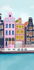 Et poetisk blik på Amsterdam af Petra Lizde: slanke kanalhuse med gavle spejler sig i det stille vand, mens en lille båd glider forbi under en rosa aftenhimmel. Dæmpede pasteller og grafiske linjer skaber en elegant, tidløs stemning, hvor byens rytme møder drømmende ro. Perfekt til elskere af ikonisk arkitektur og vandets stille poesi.