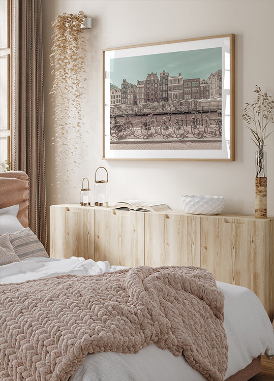 Tag med til Amsterdam langs Singel-kanalen og den legendariske Bloemenmarkt. Plakaten af Melanie Viola indfanger de ranke kanalhuse, cykler parkeret langs rækværket og det stille vand, badet i en urban vintage-stemning med subtile kontraster. Et tidløst blik på byens puls og poesi. Perfekt til dem, der elsker klassisk arkitektur og cykelkultur.