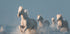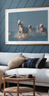 Imponujące zdjęcie dzikich białych koni z Camargue, uchwycone podczas galopu przez fale. Krople wody błyszczą w powietrzu, podkreślając ich siłę, ruch i dziką duszę. Ta zapierająca dech w piersiach scena wyraża wolność, energię i ponadczasowe piękno natury.