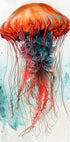 Oszałamiająca akwarelowa ilustracja meduzy z ognistym pomarańczowym dzwonkiem i długimi pasmami unoszącymi się z wdziękiem w odcieniach błękitu. Ta grafika morska oddaje elegancję podwodnego życia z malarskimi szczegółami, łącząc sztukę i naturę w zapierającej dech w piersiach scenie wodnej.