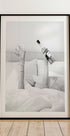 Zabawna czarno-biała grafika przedstawiająca dłonie trzymające butelkę Aperolu i kieliszek do wina na miękkich białych prześcieradłach. Minimalistyczne, ale efektowne – zabawne i stylowe dzieło sztuki, idealne do nowoczesnych wnętrz, kuchni, barów lub sypialni z odrobiną dodatkowej osobowości.