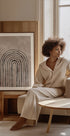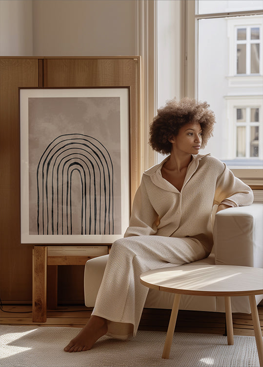 Graficzny i minimalistyczny motyw z czarnymi łukami wznoszącymi się rytmicznie warstwami na ciepłym beżowym tle. Wyraźna symetria i kontrast między światłem i ciemnością tworzą spokój, głębię i kierunek. Ponadczasowy punkt centralny, który dodaje równowagi salonowi, przedpokojowi lub domowemu biuru. Pięknie pasuje do pomieszczeń inspirowanych kuchnią nordycką, nowoczesną i inspirowaną kuchnią japońską.