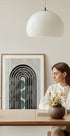 Uderzający abstrakcyjny plakat z warstwowymi czarnymi łukami otaczającymi kolumnę zielonych półkoli. Geometryczna kompozycja łączy w sobie symetrię, głębię i kontrast, tworząc przyciągający wzrok modernistyczny design. Idealny do wnętrz minimalistycznych, nowoczesnych przestrzeni oraz dla tych, którzy kochają abstrakcyjną grafikę liniową.