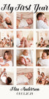 Piękny, spersonalizowany plakat dla dziecka upamiętniający pierwszy rok życia Twojego malucha. Ten wydruk kolażu fotograficznego uwiecznia dwanaście cennych wspomnień, od chwil noworodkowych po pierwsze kamienie milowe. Ponadczasowa pamiątka i idealny prezent dla rodziców, dziadków lub wystrój pokoju dziecięcego.