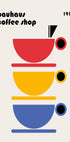 Inspirowany Bauhausem plakat kawiarni z 1919 roku przedstawiający trzy ułożone w stos filiżanki w kolorze czerwonym, żółtym i niebieskim w odważnych geometrycznych kształtach. Minimalistyczny, ale żywy, ten projekt wyraża artystycznego ducha modernizmu i kultury kawiarnianej. Idealna dekoracja ścienna dla kuchni, kawiarni i miłośników stylu Bauhaus.