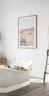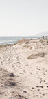 Spokojne zdjęcie wybrzeża przedstawiające piaszczystą ścieżkę prowadzącą do morza. Miękkie ślady stóp na piasku, dzika trawa plażowa i fale morskie w oddali tworzą spokojną i nostalgiczną atmosferę. Idealny do wprowadzenia letniego spokoju do każdego pomieszczenia.
