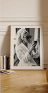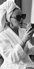 Wyrafinowane czarno-białe zdjęcie kobiety w szlafroku z ręcznikiem na głowie, nakładającej szminkę, w okularach przeciwsłonecznych i wyrazistej biżuterii. To eleganckie dzieło sztuki celebruje piękno drobnych rytuałów i ponadczasowy blask, idealne do wnętrz inspirowanych modą.