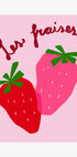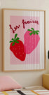 Zabawny i żywy plakat z truskawkami w mocnych odcieniach czerwieni i różu z odręcznym francuskim tekstem „Les fraises”. Idealny do wystroju kuchni w stylu retro, inspiracji walentynkowej lub dla każdego, kto kocha sztukę owocową.