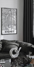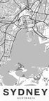 Czysta, czarno-biała mapa Sydney, na której sieć ulic miasta i kręta linia brzegowa przedstawiają się ostrymi liniami i drobnymi szczegółami. Sylwetka portu i charakterystyczne dzielnice wyraźnie się wyróżniają, a subtelna faktura nadaje dyskretny, vintage charakter - idealny zarówno do nowoczesnych, jak i retro wnętrz w domu.