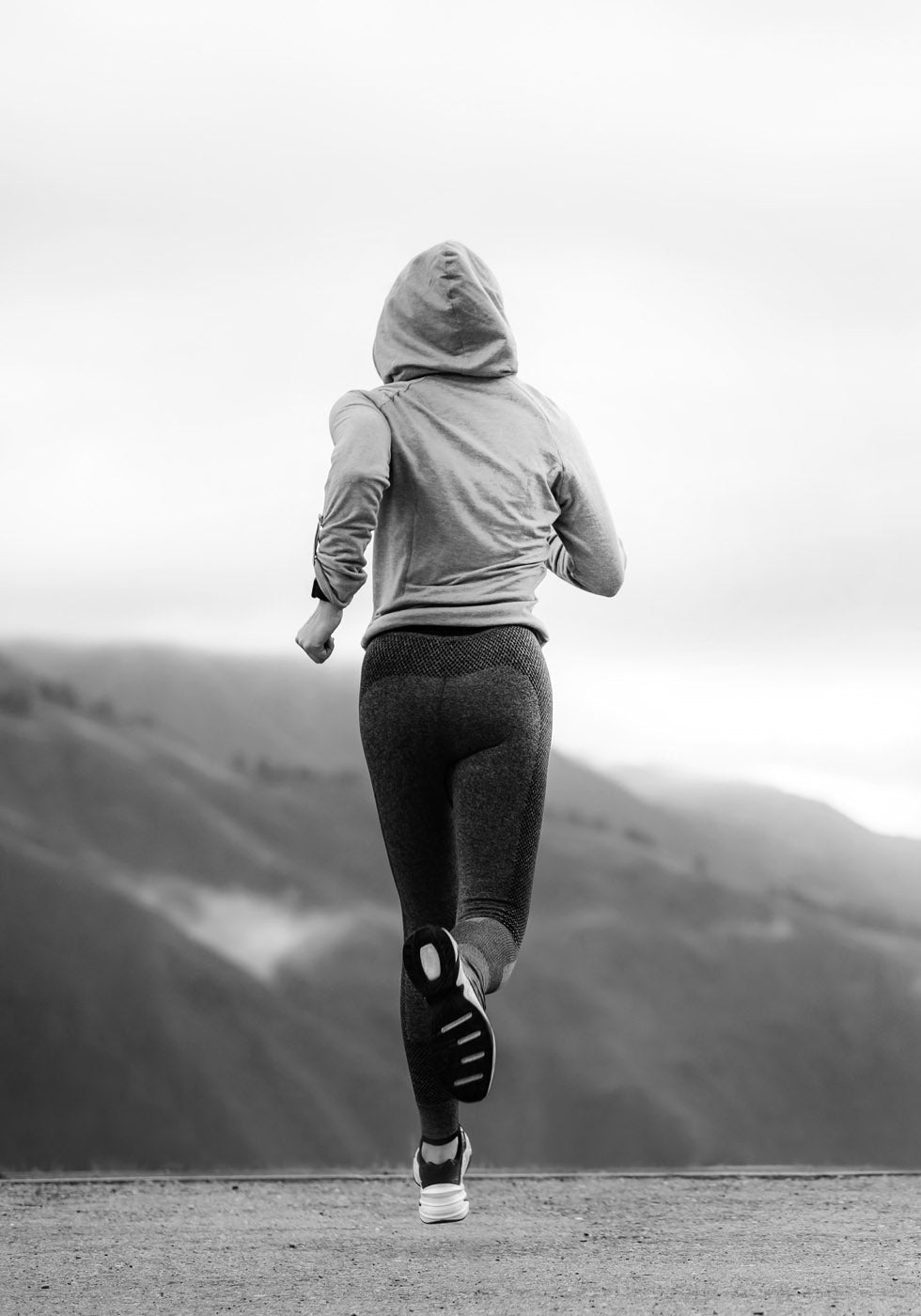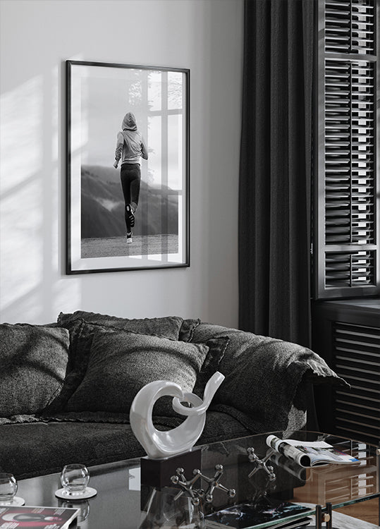Uderzająca czarno-biała fotografia, która oddaje istotę wytrwałości i determinacji. Grafika przedstawiająca biegacza w ruchu na tle gór symbolizuje siłę, wytrzymałość i determinację. Idealny plakat motywacyjny dla entuzjastów fitnessu i osób prowadzących aktywny tryb życia.