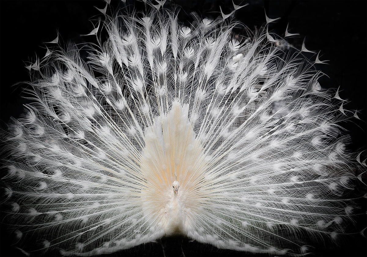 Oszałamiająca fotografia rzadkiego białego pawia z całkowicie rozpostartymi piórami, tworzącymi misterny i delikatny wzór czystej elegancji. To przyciągające wzrok dzieło sztuki symbolizuje piękno, wdzięk i rzadkość i staje się fascynującym centralnym punktem każdego wystroju.