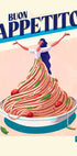 Wesoły i zabawny plakat inspirowany kuchnią włoską z uderzającym zwrotem Buon Apetyczny. Przedstawia kobietę, której sukienka spływa po górze spaghetti z pomidorami i bazylią, humorystyczne połączenie kultury kulinarnej i ilustracji w żywym dziele sztuki.