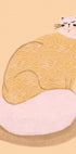 Fantazyjna ilustracja białego kota ubranego w wzorzysty, maślanożółty sweter z falującymi wzorami. Nowoczesny i przytulny styl w połączeniu z delikatną pastelową paletą sprawia, że idealnie nadaje się do eklektycznych wnętrz, pokoi dziecięcych lub jako zabawne dzieło sztuki dla miłośników kotów.