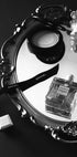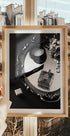 Stylowa czarno-biała fotografia produktów kosmetycznych Chanel, przedstawiająca kultowe perfumy Gabrielle Chanel, elegancką wstążkę i wyrafinowane detale na lustrze w stylu vintage. Ten nadruk wyraża ponadczasowy francuski luksus i wyrafinowanie i staje się eleganckim akcentem we wnętrzach inspirowanych modą, pięknem i klasyczną elegancją.