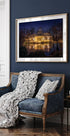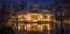 Et stemningsfuldt nattebillede af Madrids Palacio de Cristal, hvis elegante glaskuppel spejler sig i den stille dam. Omgivet af træernes silhuetter og varme lys skaber motivet en rolig, poetisk atmosfære. Symmetrien og refleksionerne leder blikket mod paladsets detaljer. Foto af Bartolome Lopez. Madrid, Spanien.