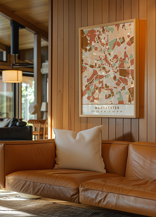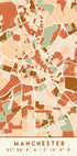 Black Maps Earth Tones 45 autorstwa Emiliano Deificusa to stylizowana mapa miasta Manchester w stonowanych odcieniach ziemi i głębokiej czerni. Cienkie linie ukazują ulice i dzielnice jako wzór graficzny, w którym kontrasty i faktura tworzą głębię. Elegancki, miejski plakat, który łączy w sobie spokój i surową energię. Idealny do nowoczesnego domu i biura.