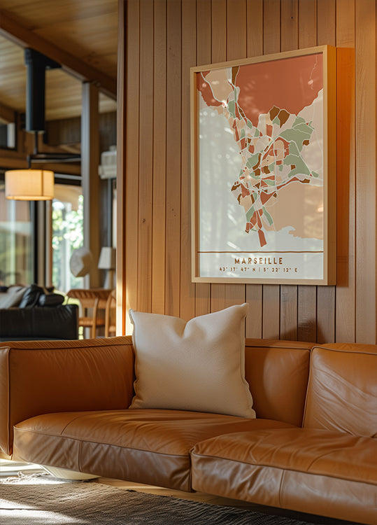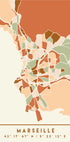 Black Maps Earth Tones 48 autorstwa Emiliano Deificusa to stylizowana mapa miasta Marsylii w ciepłych odcieniach ziemi w głębokiej czerni. Czyste linie i graficzny spokój bez hałasu oddają puls miasta i nadmorską geometrię, zapewniając wyrafinowany, ponadczasowy wyraz, który podnosi poziom wszystkiego, od salonu po biuro. Idealny do nordyckiego minimalizmu.