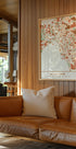 Sugestywny plakat z mapą miasta Melbourne autorstwa Emiliano Deificusa. Ciemne, czarne powierzchnie spotykają się z ciepłymi odcieniami ziemi, gdzie ulice, dzielnice i wybrzeże wyłaniają się jako eleganckie linie i pola. Stylowy, miejski przyciągający wzrok, oddaje rytm wielkiego miasta i zaprasza do codziennych odkryć. Idealnie nadaje się do salonu, biura lub gabinetu.