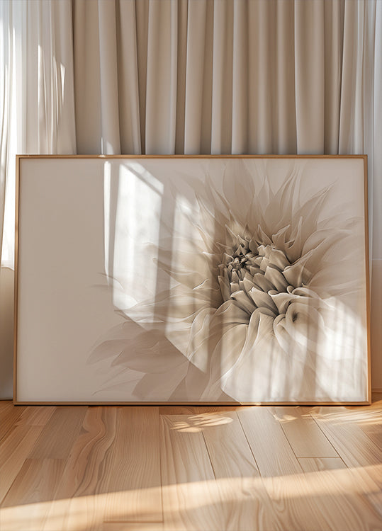 Wyrafinowane zbliżenie dalii w delikatnych odcieniach sepii. Monochromatyczna stylistyka oraz delikatne detale płatków nadają całości ponadczasowej i dostojnej elegancji, doskonale wpisującej się w spokojne i nowoczesne wnętrza.
