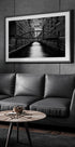 Dramatyczna, monochromatyczna podróż przez hamburską dzielnicę kanałów: ceglane fasady i niski most przyciągają wzrok ku horyzontowi, podczas gdy nieruchoma woda odbija światło i cień. Stefan Eisele oddaje chłodny spokój miasta za pomocą wąskich linii, symetrii i głębi – miejskiego motywu zachęcającego do kontemplacji. Motyw jest hołdem dla ponadczasowej geometrii Speicherstadt.
