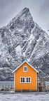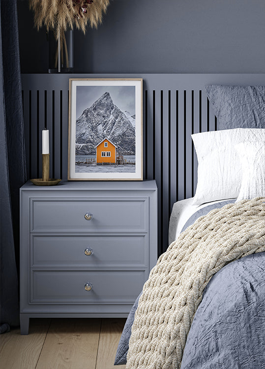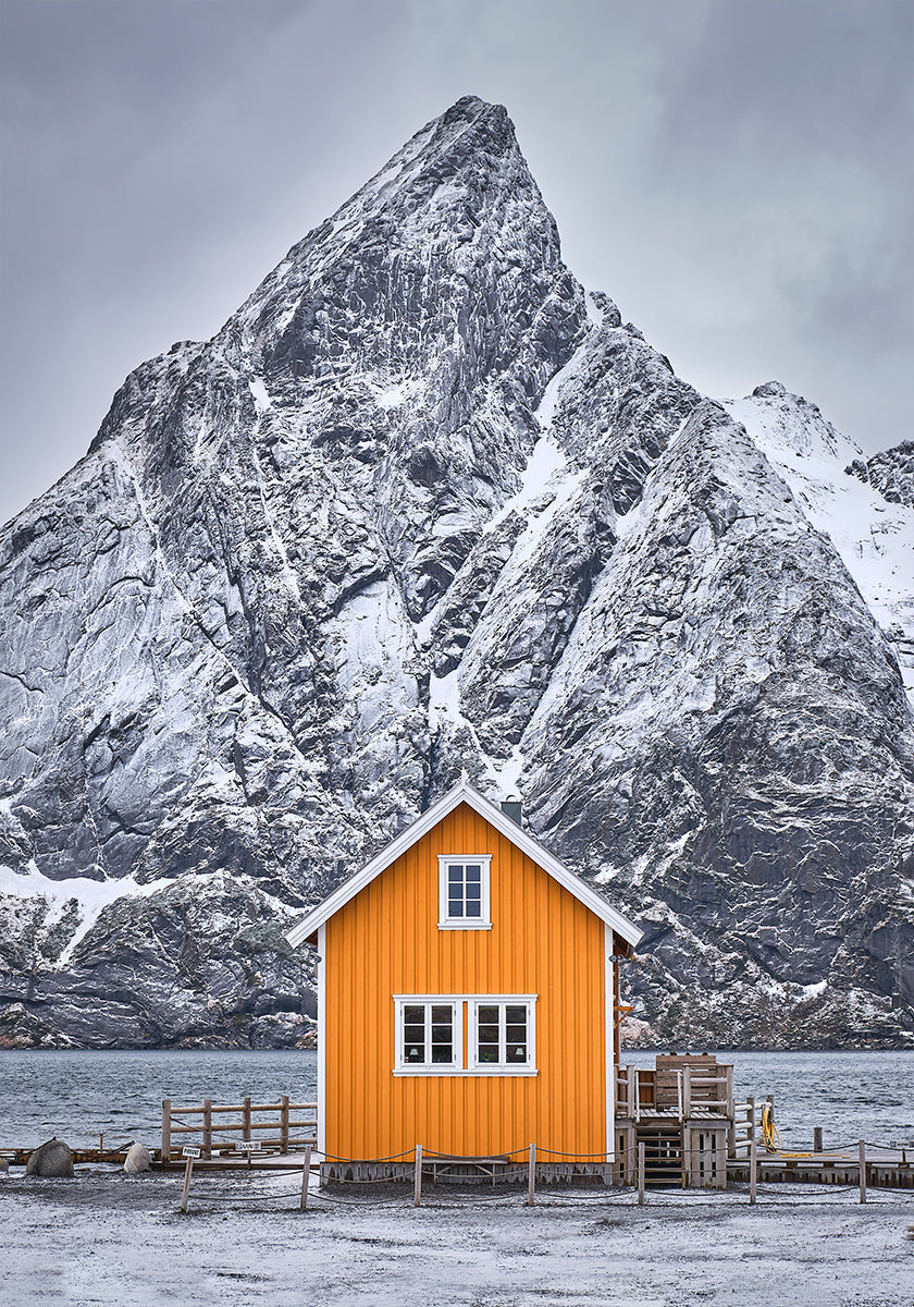 Ten sugestywny plakat autorstwa Hamed Bank przedstawia samotną żółtą chatkę na nordyckim wybrzeżu, otoczoną ośnieżonymi górami i ciemnoniebieskim morzem. Dramatyczne chmury unoszą się po niebie, a zimowe światło podkreśla kontrast między ciepłym kolorem domu a chłodnym, mroźnym krajobrazem. Spokojna, surowa i ponadczasowa scena, która zachęca do refleksji.