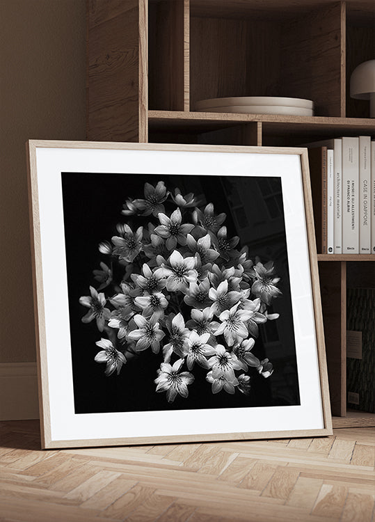 Early Sensation autorstwa Yvette Depaepe – sugestywna, monochromatyczna martwa natura, w której delikatne kwiaty powojników wyłaniają się z ciemnego, stonowanego tła. Drobne płatki łączą się, tworząc poetycki bukiet o ostrym kontraście i harmonijnym rytmie – hołd dla piękna botanicznego i cichej obietnicy wiosny. Ponadczasowy element przyciągający wzrok.