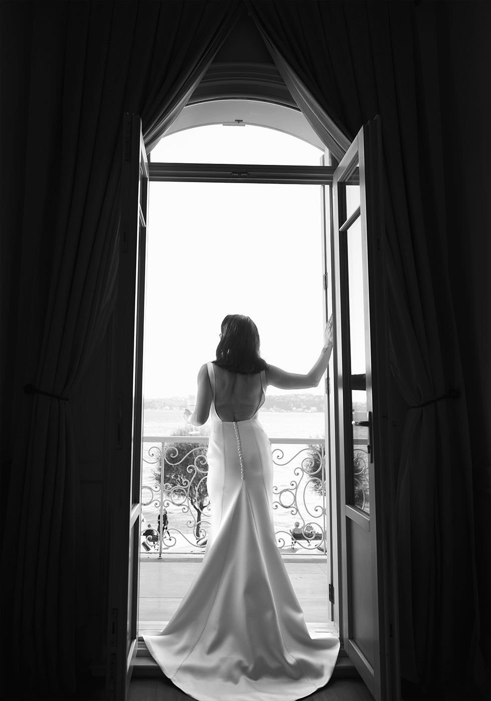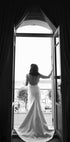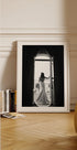 Oszałamiająca czarno-biała fotografia, która oddaje elegancję kobiety w zwiewnej sukni wyglądającej z balkonu. Kompozycja podkreśla ponadczasowy wdzięk, wyrafinowany styl i spokojne piękno, dzięki czemu jest idealnym dziełem sztuki do wnętrz celebrujących modę, romantyczność i wyrafinowanie.