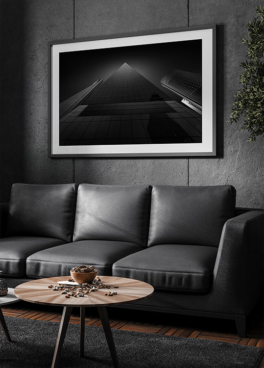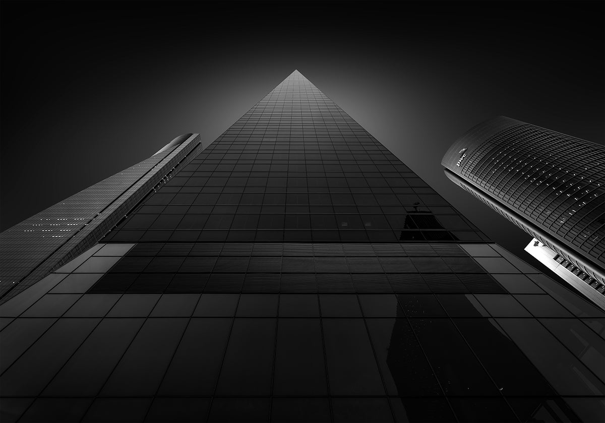 En grafisk, moderne hyldest til Madrids skyline: Jorge Ruiz Dueso indfanger CTBA’s ikoniske skyskrabere i et skarpt, geometrisk perspektiv, hvor fem tårne rejser sig mod himlen. Kontrasten mellem glas, stål og den åbne himmel skaber rytme, dybde og storbyenergi i et tidløst motiv. Perfekt til arkitektur- og designelskere.