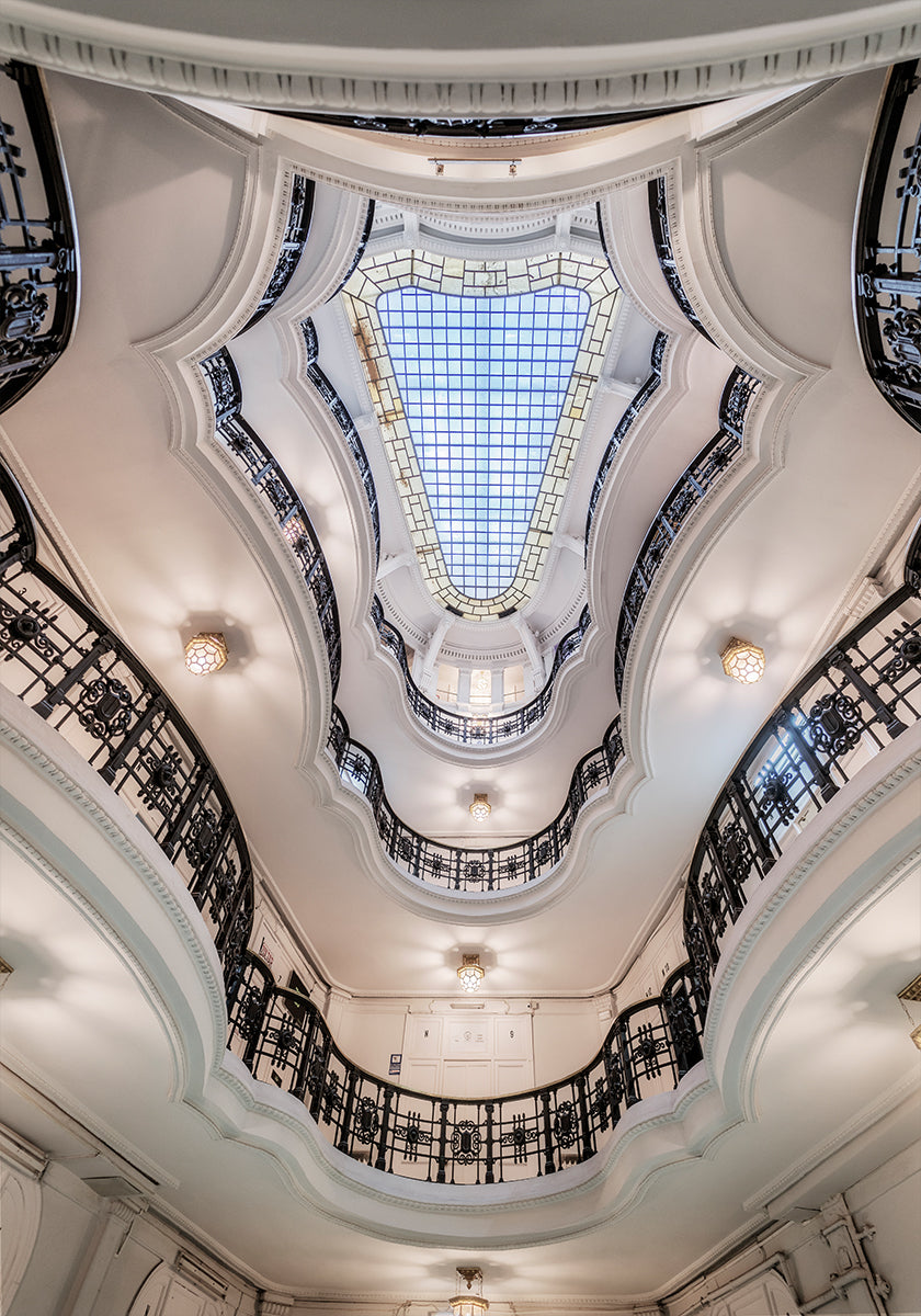 Et hypnotisk blik op gennem den ikoniske trappe i Casa Palazuelo i Madrid, fanget af fotografen Jorge Ruiz Dueso. De svungne linjer og gentagne etager danner et grafisk mønster, hvor lys og skygge danser. En urban hyldest til arkitekturens poesi, der løfter enhver væg. Perspektivet leder blikket opad, gennem former og dybde, og giver rummet ro.
