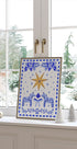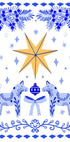 Nastrojowy zimowy plakat inspirowany folkiem autorstwa Aliya Putrus: złota gwiazda pośrodku otoczona płatkami śniegu, jagodami i ozdobną kokardką, z małym koniem Dala jako uroczym detalem. Odcienie błękitu, bieli i brązu tworzą skandynawską atmosferę świąt, ciepłą i nostalgiczną. Idealnie sprawdzi się w przedpokoju, salonie czy pokoju dziecięcym w okresie świątecznym.