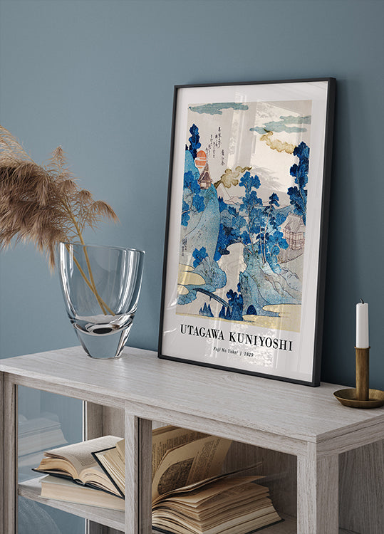 Spokojny drzeworyt z okresu Edo autorstwa Utagawy Kuniyoshi, przedstawiający widoki góry Fudżi na tle błękitnego krajobrazu pełnego świątyń i krętych rzek. Dzieło odzwierciedla tradycyjny styl ukiyo-e z dbałością o detale i stonowaną kolorystyką.