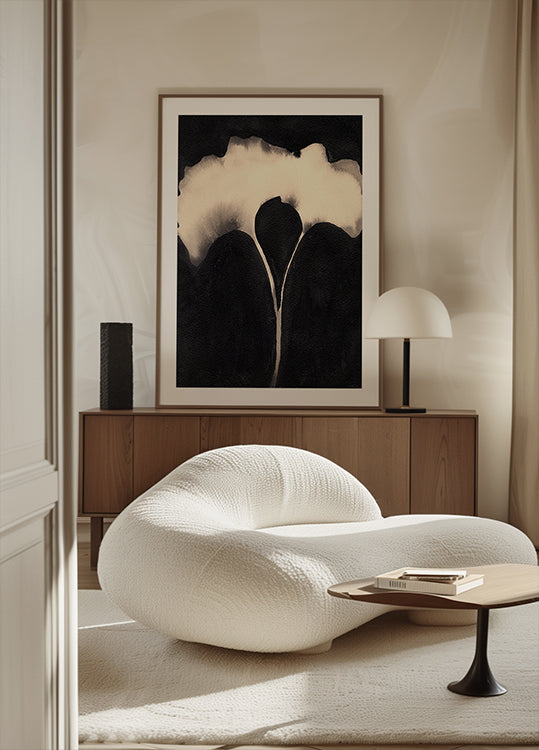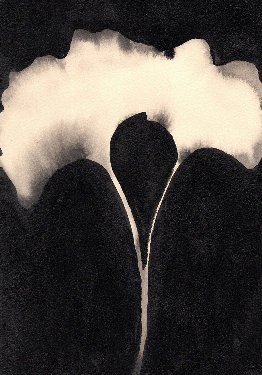 En elegant, minimalistisk plakat af Janel Bragg, hvor to delikate gingkoblade svæver i et poetisk møde mellem sort blæk og bløde beige toner. Sumi-inspirerede strøg og let bleeding skaber dybde og ro, mens den høje kontrast fremhæver bladets organiske linjer i en moderne, asiatiskpræget æstetik. Perfekt til rolig vægkunst.