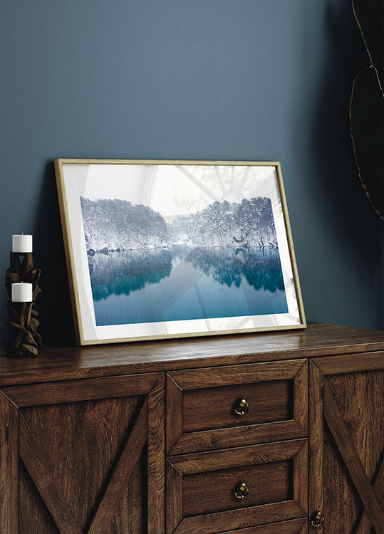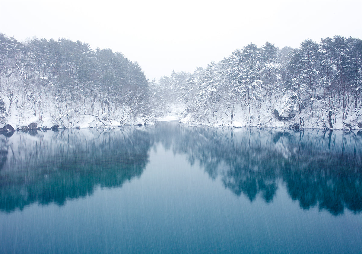 Spokojna zimowa chwila w Goshiki-numa w Urabandai: mgła unosi się nad zamarzniętym jeziorem, sylwetki jodeł odbijają się w lodowatej wodzie, a cienka warstwa śniegu tłumi wszelkie dźwięki. Sasaki Makoto oddaje poetycki spokój natury i subtelne niebiesko-szare odcienie, które zachęcają do kontemplacji. Cichy towarzysz w najcichszych zakątkach domu.