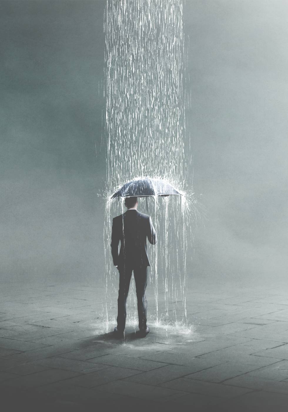 Surrealistyczne dzieło przedstawiające mężczyznę w garniturze z parasolem, na którego pada deszcz. Suche tło podkreśla poczucie samotności i presji psychicznej. Mocna metafora wizualna w spokojnych odcieniach szarości.
