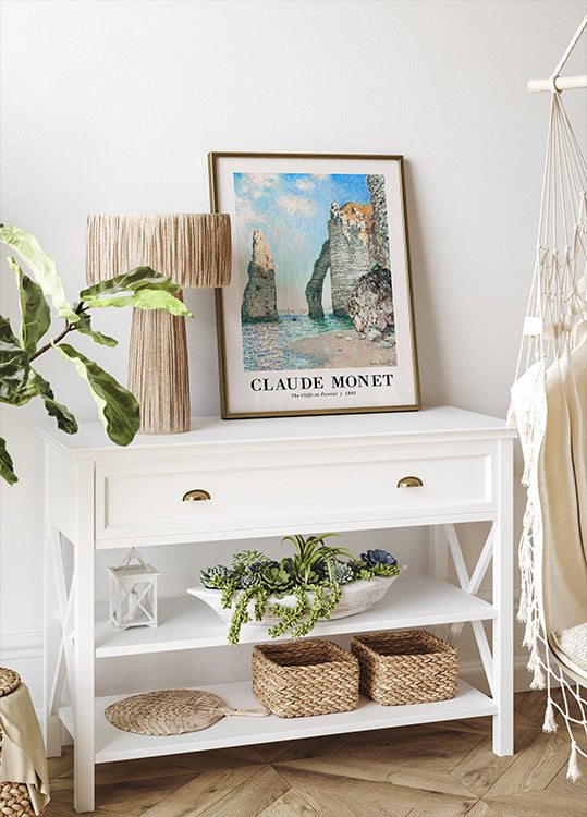 Zapierający dech w piersiach impresjonistyczny obraz Claude'a Moneta przedstawiający kultowe klify Étretat. Dzięki charakterystycznym pociągnięciom pędzla i odbijającym światło kolorom ten klasyczny pejzaż morski oddaje surowe piękno natury. Idealny dla miłośników sztuki i wielbicieli Moneta.